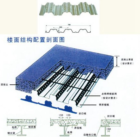3、組合板的厚度不應(yīng)小于90mm;壓型鋼板頂面以上的混凈土厚度不應(yīng)小于50mm。
